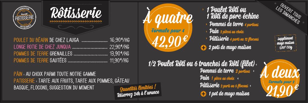 Une formule inédite complète : poulet, pommes de terre, pâtisserie et pain ! Pour 2 ou pour 4 personnes !